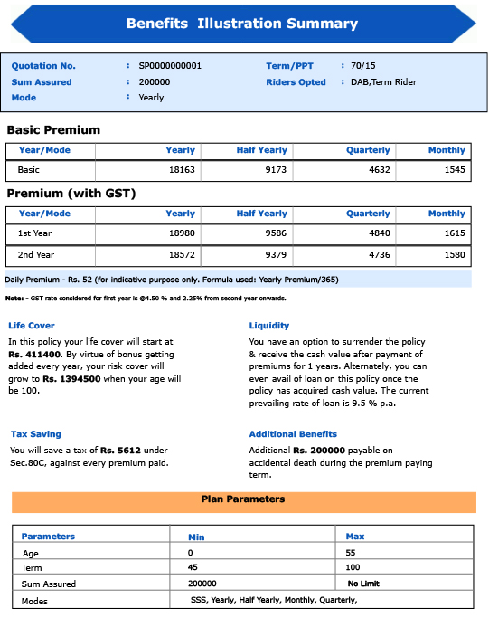 • Settlement option available for maturity and death benefits in instalments 5, 10, and 15 years.